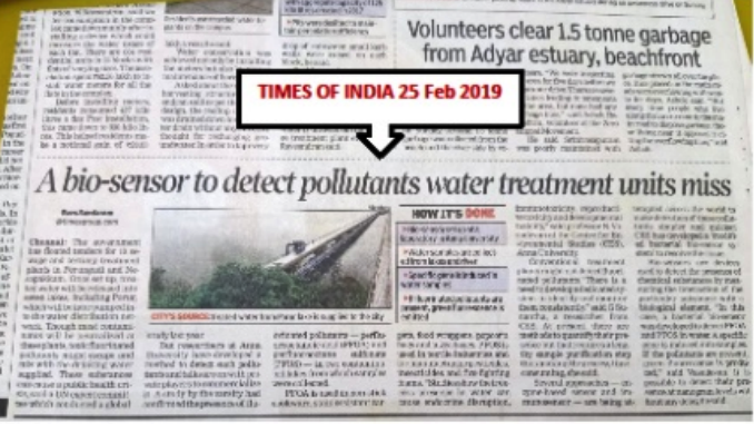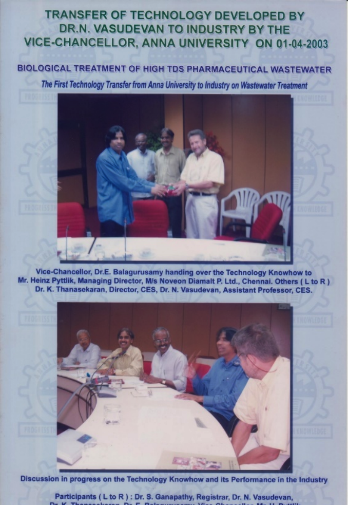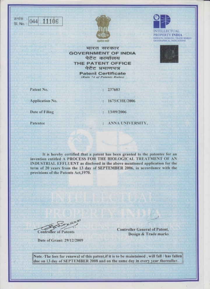 | Students Innovative Project Comprehensive treatment of secondary treated greywater for reuse in irrigation and ground water recharge | Centre for Technology Development and Transfer, Anna University | 2019 to 2020 |